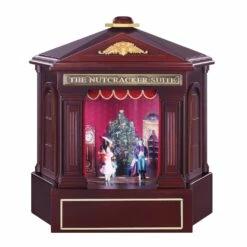 The Nutcracker Suite by Mr. Christmas brings the Tchaikovsky’s classical ballet to center-stage inside your home. Inside a dark wooden theater with bronze accents, a velvet curtain opens and closes between different scenes as Tchaikovsky’s musical compositions are played. A dramatic illuminated stage with spotlights showcases the dancers and moving props. The stage resets to the beginning each time the music box is turned on.