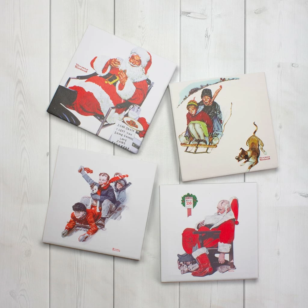 ” . . .children want to believe in Santa Claus just as fervently as we adults want to believe in Peace on Earth and goodwill toward men.” — Norman Rockwell. Decorate your walls this holiday season with these classic Norman Rockwell canvases. This assorted set includes the following paintings ‘Santa Eating Milk and Cookies’ ‘The Day After Christmas’ ‘Four Boys On a Sled’ and ‘Young Love: Sledding’. These paintings are perfect for placing on any wall in your home or gifting to that art lover in your life.