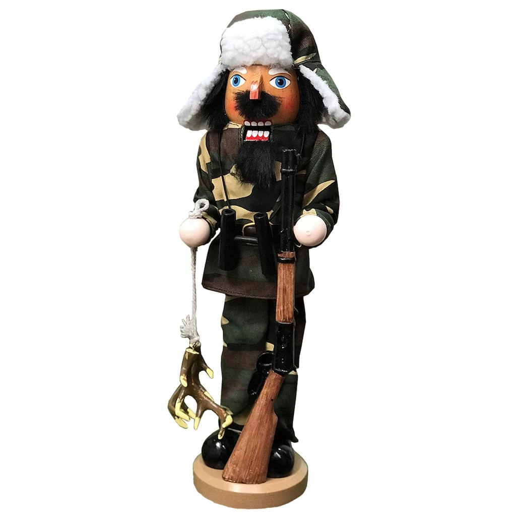 This 14″ nutcracker is great for the hunter. He is dressed in camouflage with a matching hat. He has a pair of antlers in one hand and is holding a lever action rifle.