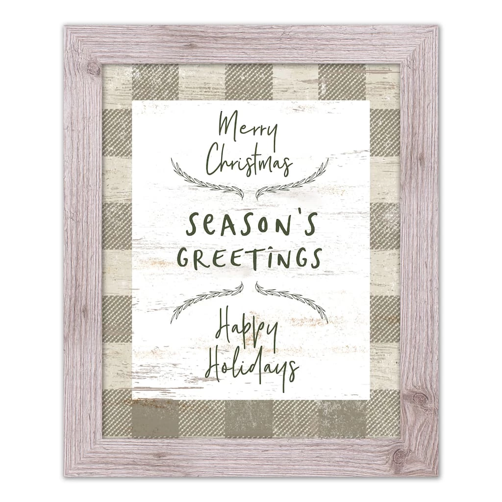 - Taupe and cream buffalo check border with green and white print in white woodgrain frame